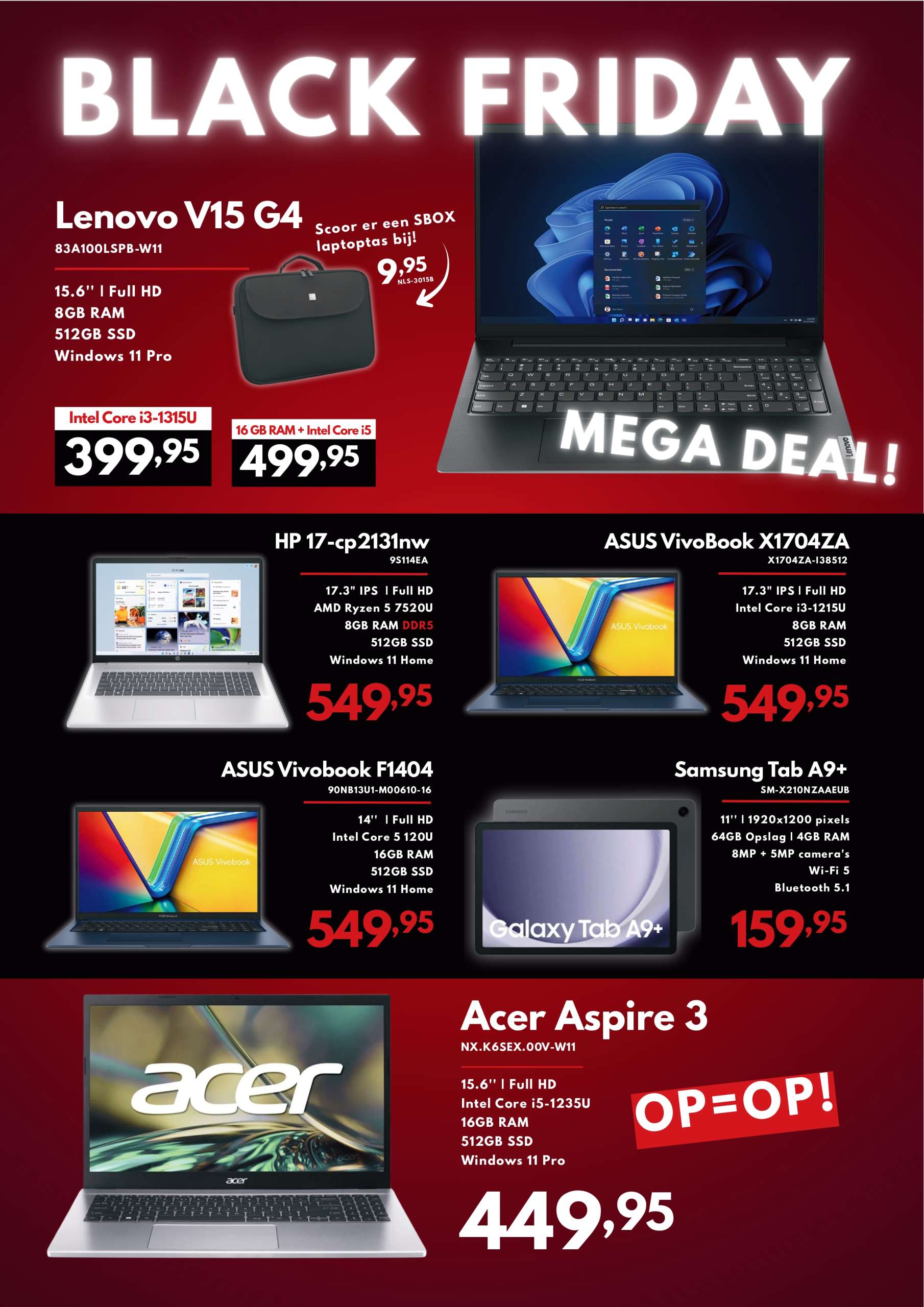 Het is weer die tijd van het jaar: Black Friday is hier! Profiteer van onze exclusieve aanbiedingen en scoor geweldige deals. Of je nu op zoek bent naar een krachtige laptop, een compacte laptop voor onderweg, of de nieuwste Samsung Tab A9+, bij ons vind je het allemaal tegen scherpe prijzen. Maar dat is nog niet alles! Ontdek ook kortingen op accessoires, gadgets en nog veel meer verrassende producten.